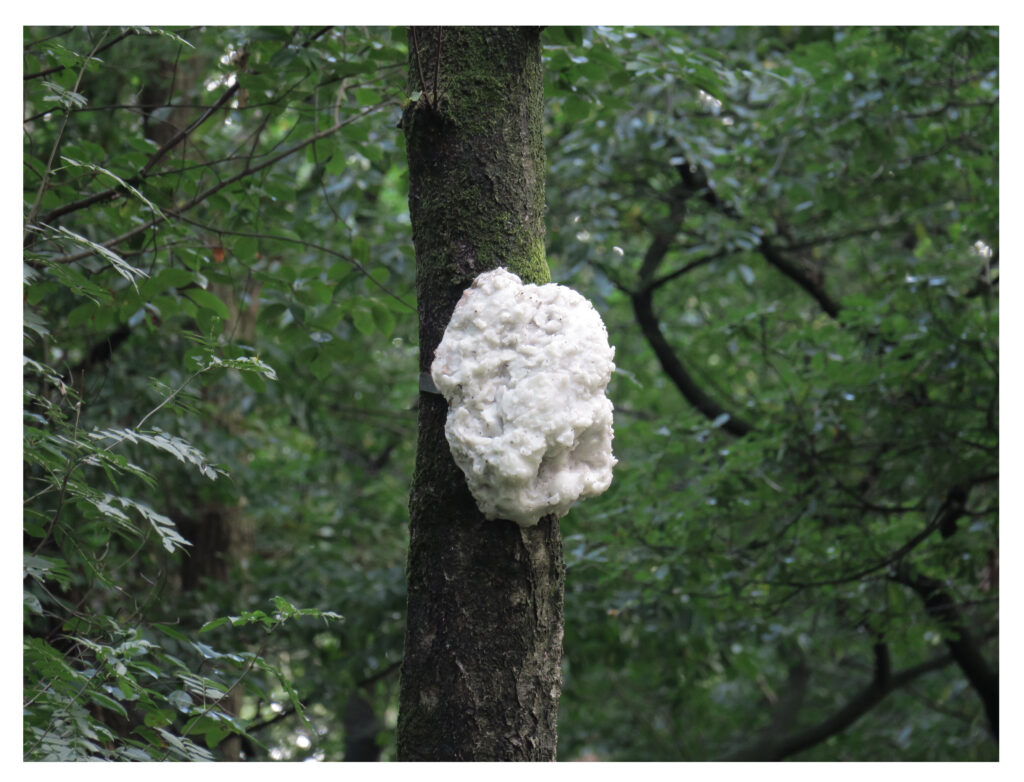 They made silicone rubber molds and wax casts of various knots and attached them like ornaments to various tree trunks. The trees are arranged in a circle around an old gravel pit. The soft yellow color of the 25 objects is reminiscent of the underground mycelium network that allows trees to communicate with each other and is also known as the Wood Wide Web. We could easily imagine the trees using the tactile resin knots as instruments to make music with each other.